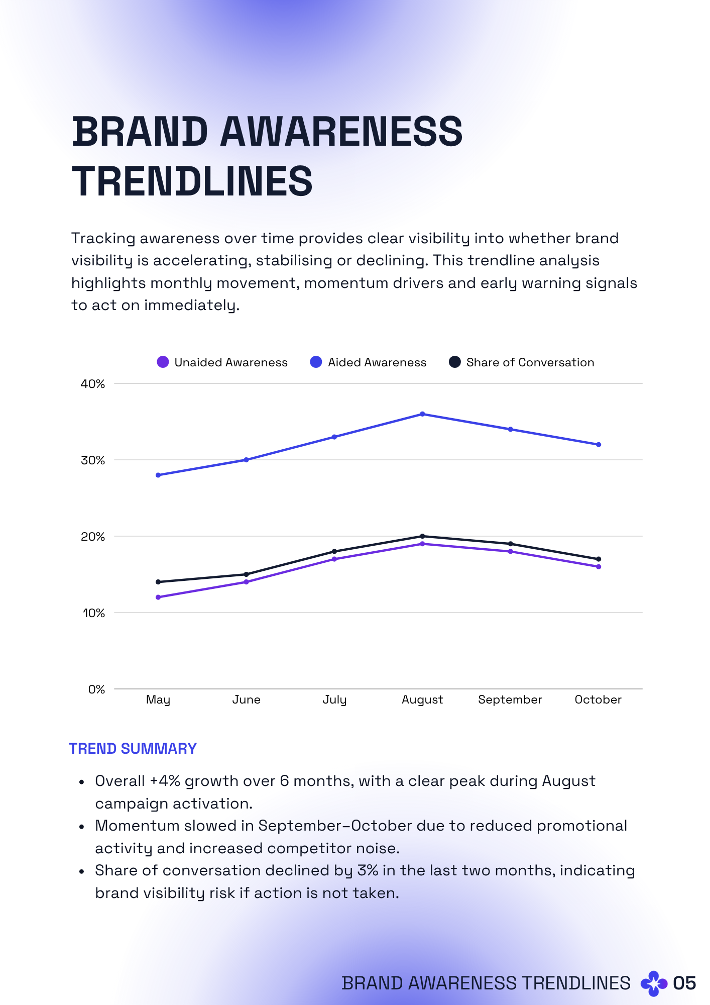 The Brand Health Scan gives you a clear view of how your brand is performing in the minds of your customers. It tracks awareness, sentiment, and share of conversation across your market to reveal whether your brand is growing in relevance or fading from it. Built for marketing leaders and PR teams, it is the fastest way to measure brand strength with precision.