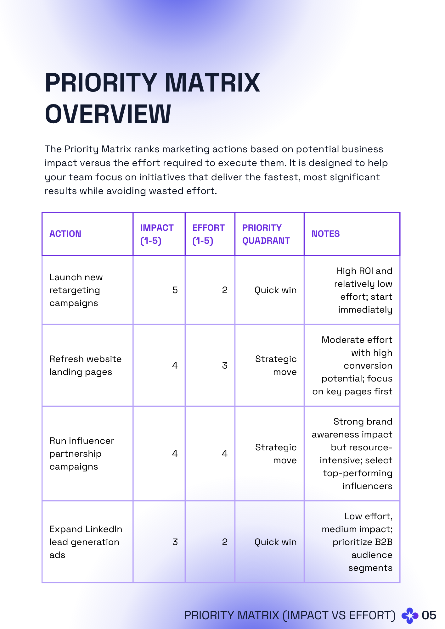 The Strategy Compass turns your marketing data into a clear, prioritised roadmap. It reviews all key channels, evaluates impact versus effort, and translates that into a tactical plan ready for execution. You receive a channel performance review, a priority matrix, and a calendar-ready action plan, all delivered in an executive report and short video walkthrough. Delivered within five business days, it gives marketing leaders clarity they can act on immediately.